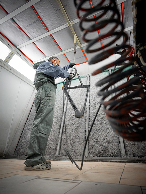 Per Thoro, la verniciatura a mano di un telaio da bici da corsa non è un semplice atto di colorazione, ma una vera e propria forma d'arte. Ogni telaio, sia esso in carbonio, acciaio o alluminio, viene preparato con cura meticolosa, levigato e pulito per garantire una superficie perfetta. Artigianalmente poi, si applica strato dopo strato la vernice. Questa dedizione si traduce in una finitura impeccabile, resistente e duratura, che protegge il telaio e ne esalta le forme.